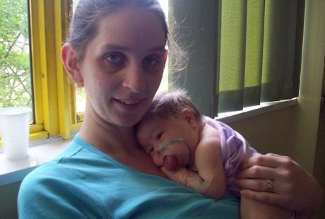Ukuran lidah Olivia yang besar membuat mulutnya tak bisa menempel di payudara ibunya, sehingga si kecil ini harus makan menggunakan bantuan tabung makan dan harus dirawat di rumah sakit selama enam minggu pertama kehidupannya.