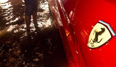 Sejumlah orang mencoba memperbaiki Ferrari yang mogok karena terjebak banjir ini